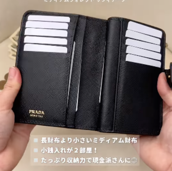 ∟PRADA(プラダ)のミディアムウォレットは、耐久性の高いサフィアーノ素材を使用。長財布まで大きくなく、ミニ財布まで小さくない独自のサイズ感で人気を博しています!ミニバッグにも入れやすいサイズ感ながら、10個のカードスロットと札入れ、2つの小銭入れがあり、カード・現金がたっぷり入ると評判なんです。