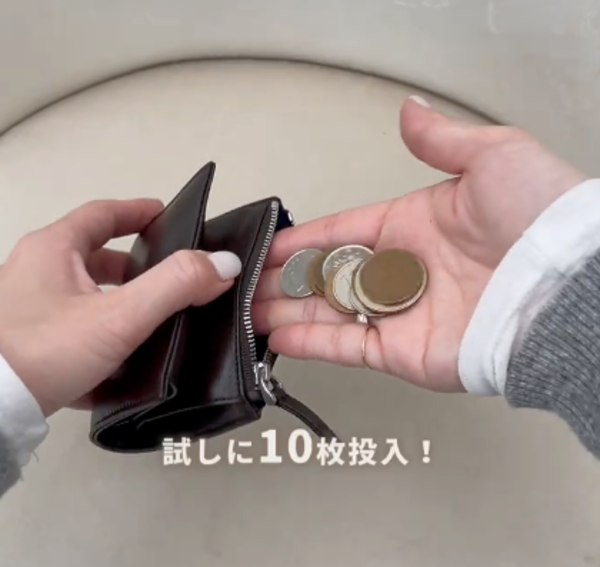 ジップコインポケット1つは、少し小さめの作りです。しかし試しに小銭を10枚ほど投入してみましたが、スッキリと収納することができました!