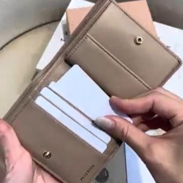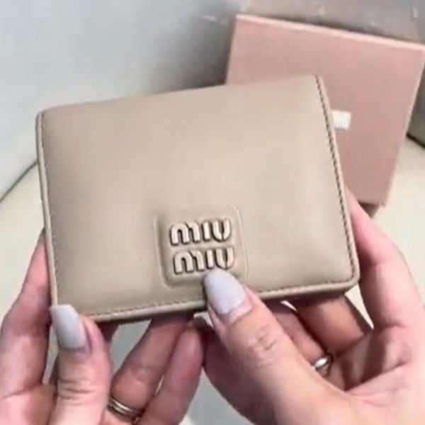 STYLE HAUSでもバズったMiuMiu(ミュウミュウ)の『ソフティパデッドレザー 折り畳み財布』。ぷっくりとしたブランドロゴとベージュのワントーンカラーが大人レディです。