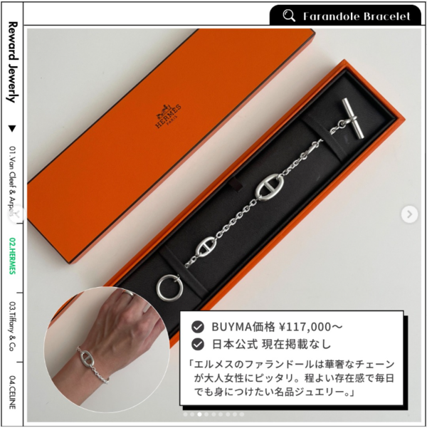 「ファランドール」はエルメスを象徴するモチーフで、船の錨をチェーンデザインにアレンジしたものです。華やかでタイムレスなファランドールブレスレットは自分への投資ジュエリーにぴったり!