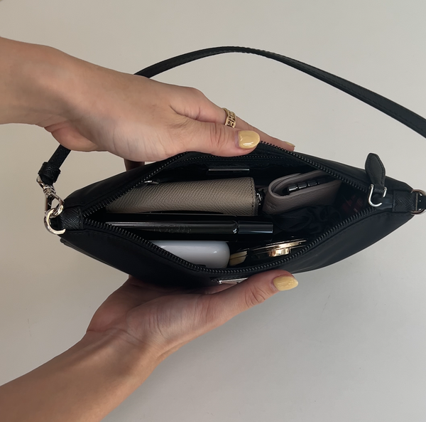 ストラップを取り付ければ、クロスボディとしても◎ 大きすぎないサイズ感なので、小柄な女性にもバランスよく持ち歩けます。