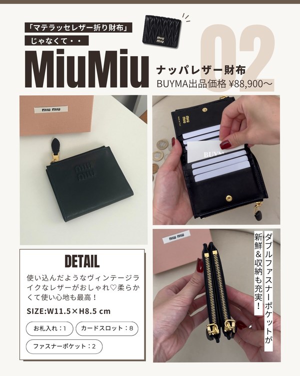 ヴィンテージのような味のあるレザーが癖になるMiu Miuのお財布です。カードスロットは8つも備えられているため、カードが多い方にもおすすめ!ダブルファスナーのポケットで収納も十分確保できます。