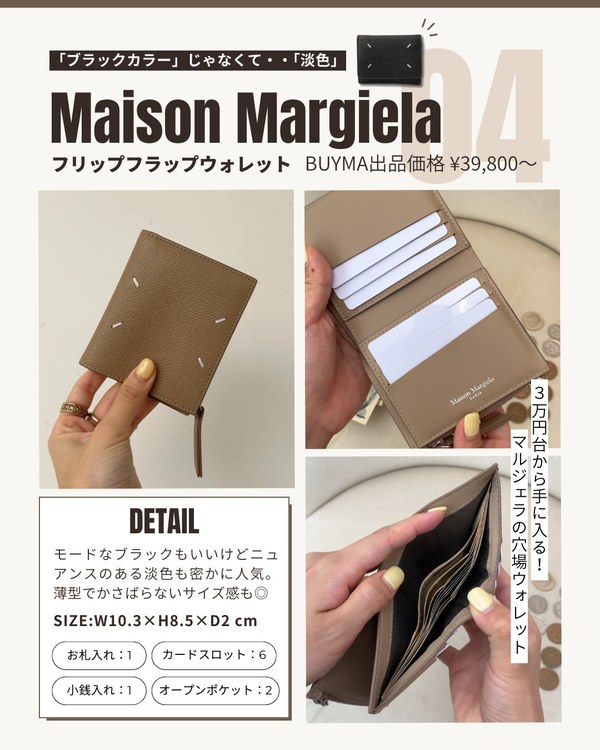 薄型でバッグの場所を取らないコンパクトなお財布。あまり物が入らないのでは、と思われがちですが、カードスロット6つ、オープンポケット2つとある程度のものは収納する事が可能!マルジェラらしいブラックもおすすめですが、ベージュなニュアンスカラーも一押し!