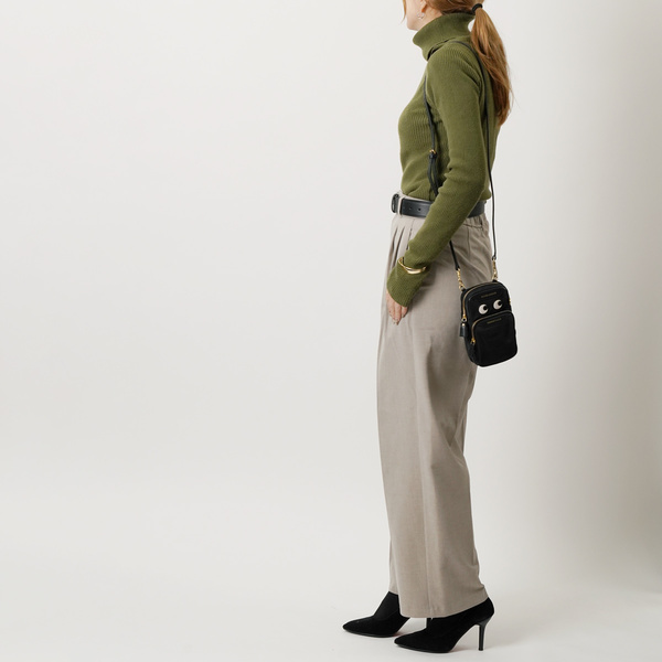アイコニックなアイズがポイントになったナイロン×レザーのショルダーバッグ。財布やスマホなど必需品を入れてさっと出かけるのにピッタリなサイズ感です。