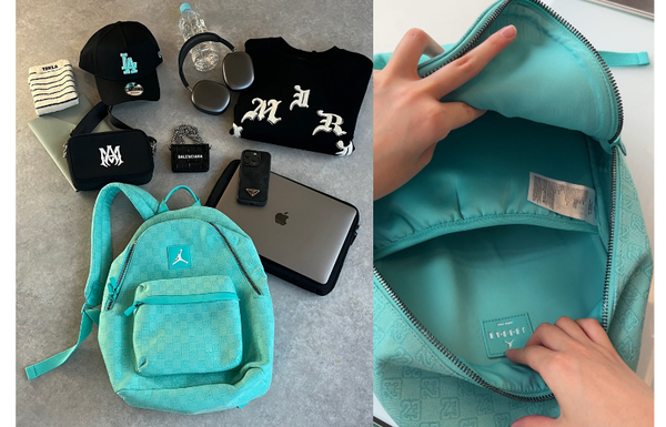 世界中に名を轟かせる伝説の元プロバスケットボール選手Michael Jordan(マイケル・ジョーダン)の背番号“23”のモノグラム+ターコイズブルーで彩られたリュックは、スポーティでありながら高級感も感じられるプレミアムデザイン。ダブルファスナー&大きく開く仕様になっているため荷物の出し入れがスムーズにできて、内側にはノートパソコンやタブレスレットを収納することができるパッド入りのスリーブが備わっています。