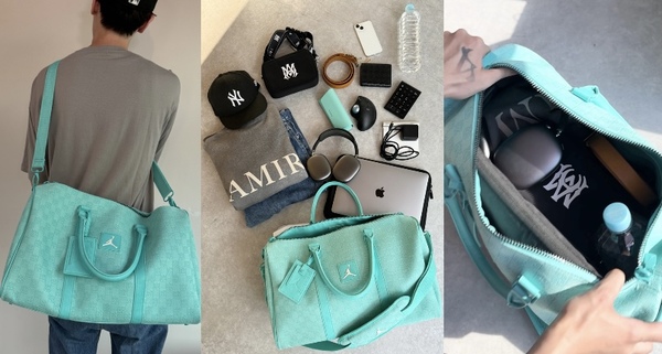 リュックと同じくモノグラム+ターコイズブルーで彩られたボストンバッグは、旅行のみならずゴルフや出張先にも持っていきやすい大容量サイズ。内側には頻繁に出し入れする必需品が収納できるジッパー付きのポケットが備わっていたりと実用性も◎で、幅広のショルダーストラップが付属しているため肩に負担がかかりにくく両手が空くのも嬉しいポイントです。