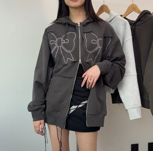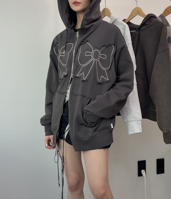 まずお取り寄せしたのは、キュートなリボンディティールのお目立ちデザインで、周囲の視線を独り占めできる、YOUHEE(ユヒ)の『RIBBON HOOD ZIP-UP』!リボンデザインに一目惚れ♡