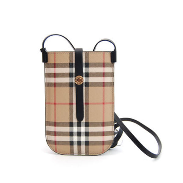 伝統的なチェック柄には、ブランドロゴ入りのスナップボタンとブラックレザーが施されています。スマホやカードがちょうど収まるサイズ感で、必要なアイテムを持ち歩くのに最適です。