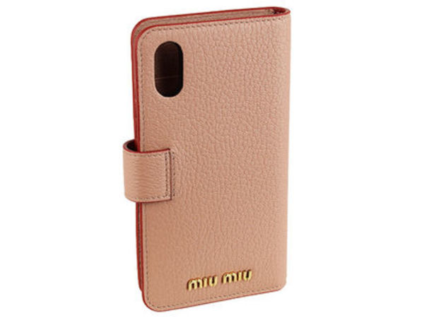 ミュウミュウのスマホケースは、上質なレザーにゴールドのブランドロゴが施されています。カラーは、クラシックなブラックや、ミュウミュウらしいピンクベージュなどがあります。