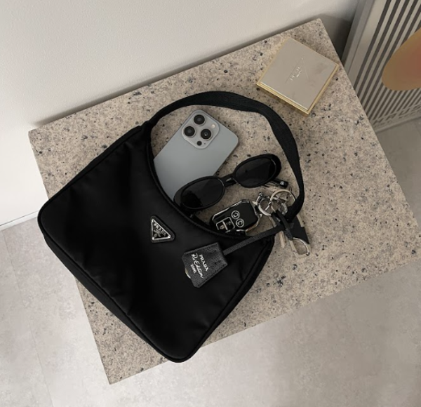 きれいめで必要最低限のものをスマートに入れて持てるプラダのリナイロンホーボ―バッグ。