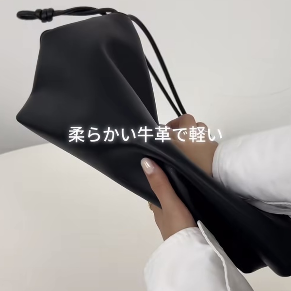 柔らかい牛革で作られており非常に軽量なバッグで、ペットボトル・折り畳み傘・iPadまで入る優れもの。紐をキュッと絞ると斜めがけとして使うこともできます。