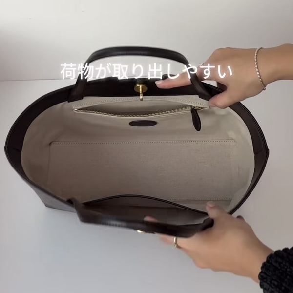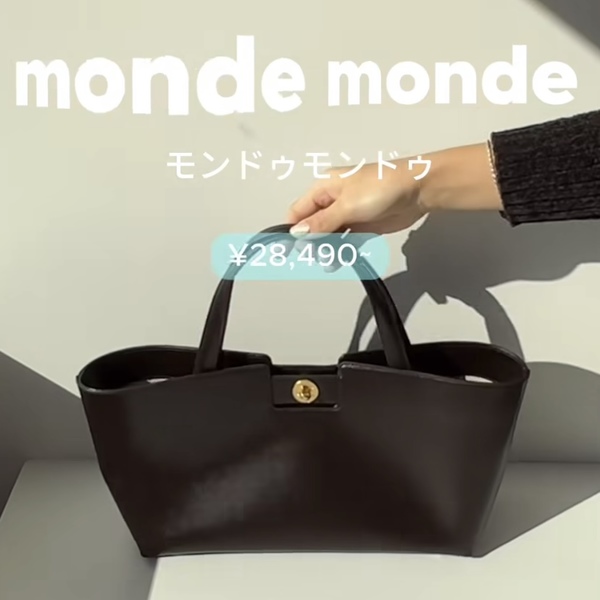 上品な艶感がおしゃれなmonde mondeのトートバッグ。ガバッと開くので荷物の出し入れがしやすいところが使い勝手を評価できるポイント。