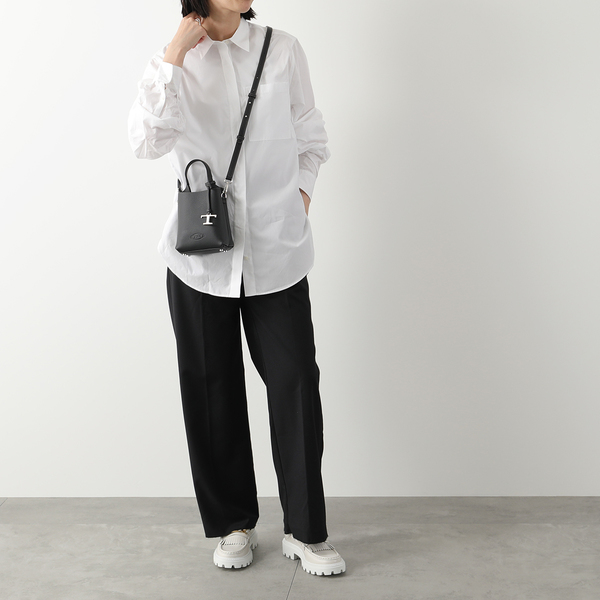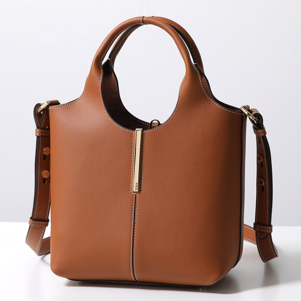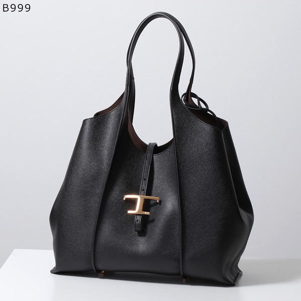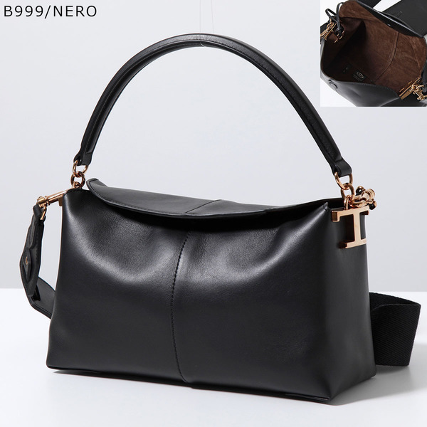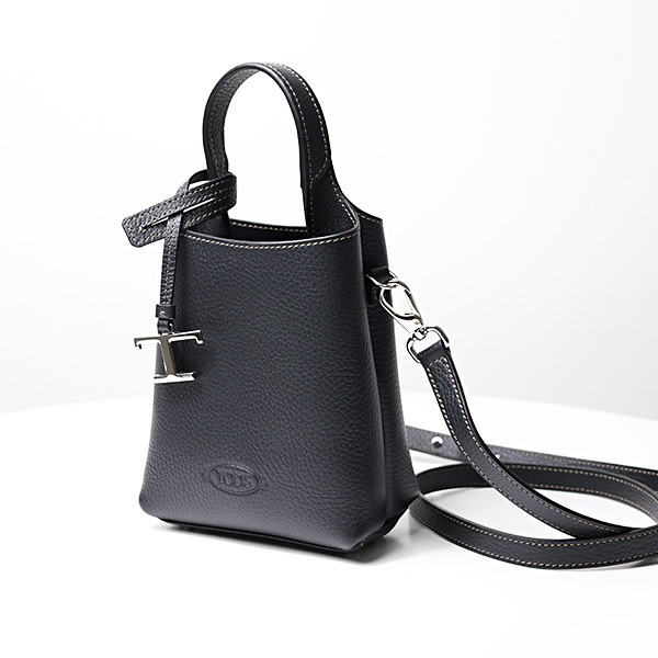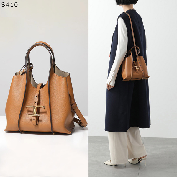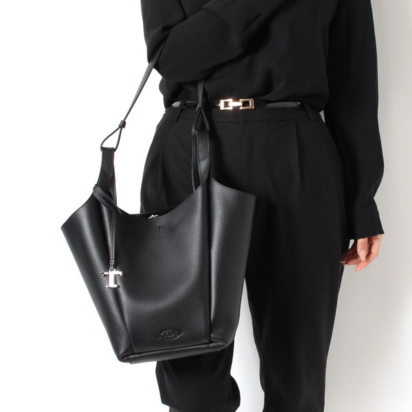 トッズを象徴する“T タイムレス”のメタルペンダントを施した台形フォルムのレザーバッグ。シボ加工を施した上質なレザーを使用しています。