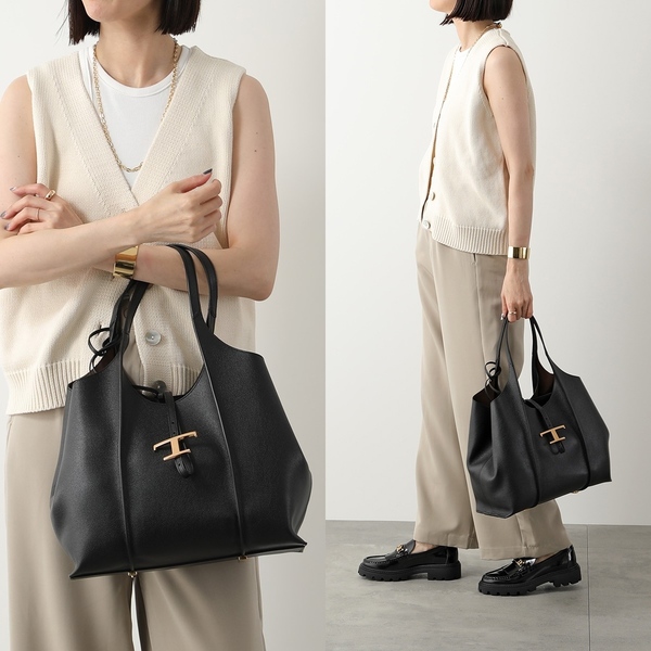 カジュアルになりがちな大きめトートですが、しなやかな曲線と“T タイムレス”のメタルペンダントがエレガントに仕上げています。