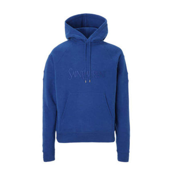 鮮やかなブルーのプルオーバーパーカーは1枚ではもちろん、インナーとしても重宝します。サンローランらしい細身のシルエットも都会的です。同系色のロゴ刺繍も上品。