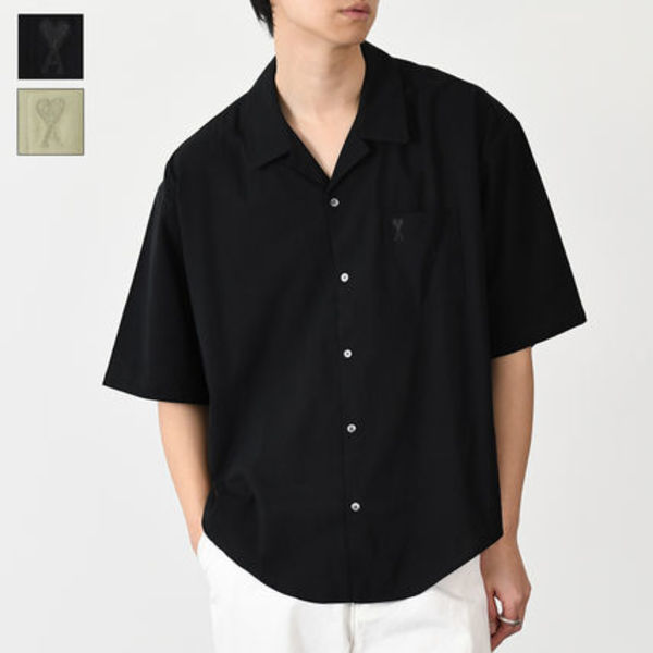 5分丈袖のボックスシルエット開襟シャツはブラックがオススメ。お洒落なレストランやディナーとなれば上品さや大人っぽさが欲しいところ。AMI PARIS(アミパリス)の開襟シャツは首元がオープンとなるのでセクシーな印象も与えます。