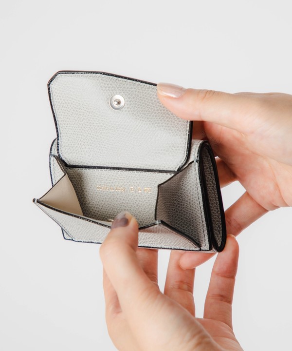 コンパクトな3つ折り財布は、前面に備え付けられたアシンメトリーカットのフラップ付きコインケースがアクセント。札入れの中には3つのカードホルダーが備えられ、程よいサイズ感でミニバッグにも収納バッチリ。