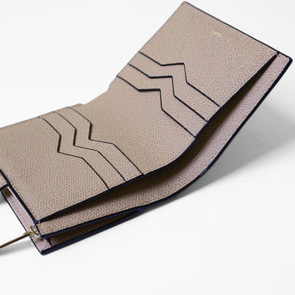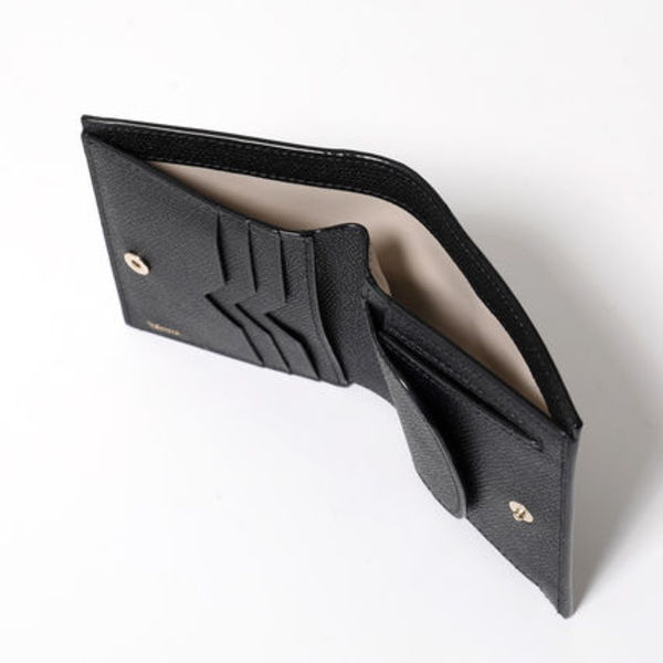 シボ加工レザーが使用された二つ折り財布は、ヴァレクストラのお財布ラインナップの中でも柔らかさが際立つ一点。スナップボタン開閉で使いやすく、開くと現れるV字カードスロットで使うたびブランドらしさを軽やかに感じることができます。