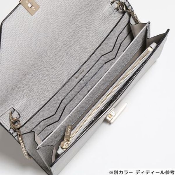 キズのつきにくい型押しレザーで高級感溢れるショルダーウォレットは、スライドロックで開閉。内側は充実した収納スペースで、チェーンストラップとコイン&カードケースは取り外し可能なのでそれぞれ単体でもお使いいただけます。オケージョンにも◎。