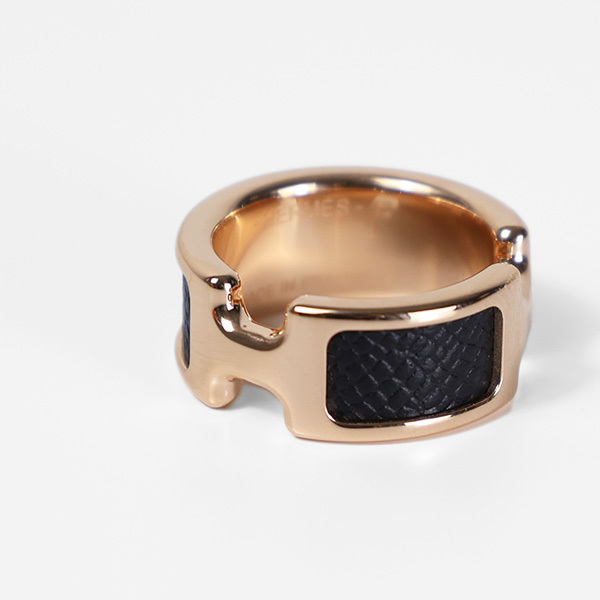 カーフスキンとメタルの組み合わせが、シンプルながらも存在感のあるエルメスらしいリング。控え目な「H」のシグネチャーが目を引きます。