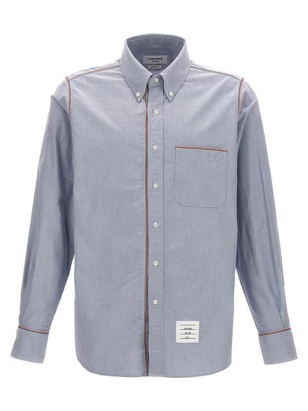 グログランフレームブルーオックスフォードコットンを使用したTHOM BROWNE(トムブラウン)のボタンダウンシャツです。アイコニックなトリコロールカラーのテープがアクセントとして効いています。
