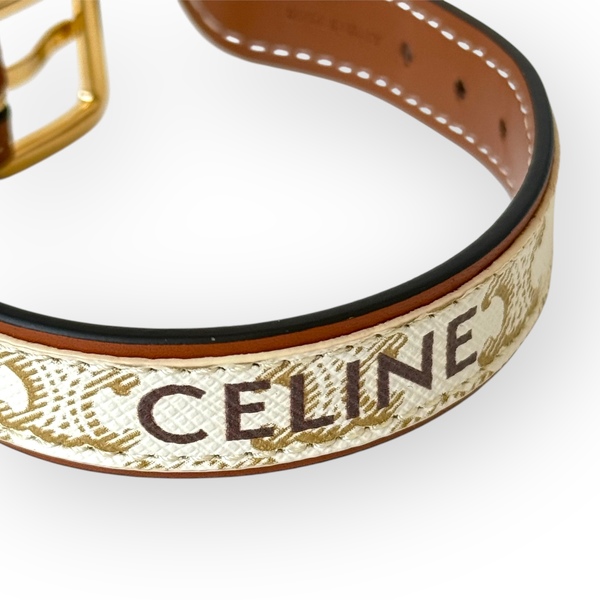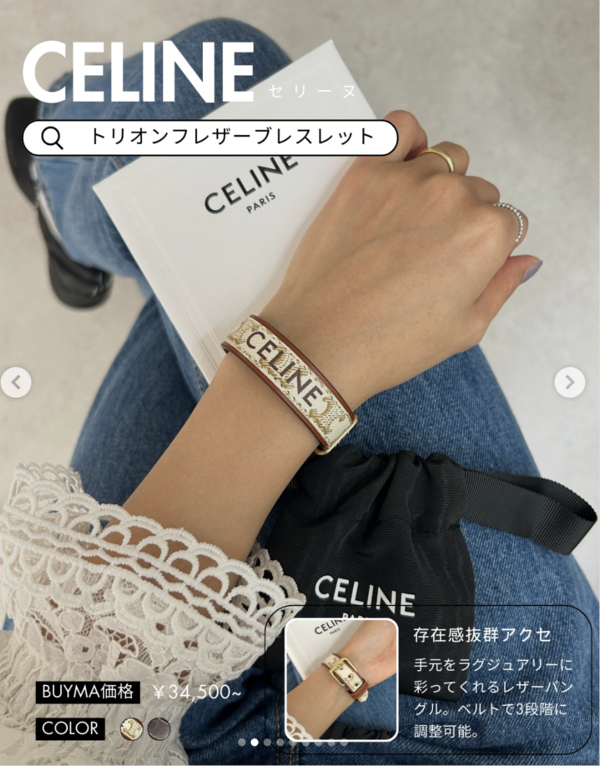 CELINE(セリーヌ)のロゴが入ったラグジュアリーなレザーバングルです。ベルトで3段階に調節できるので安心。カラーも2種類あって迷ってしまいそう!