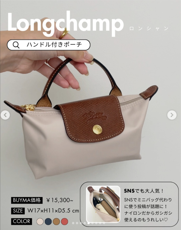 今、SNSでも大人気!ミニバッグのような使い方で話題になっているLongchamp(ロンシャン)のハンドル付きポーチ。ナイロン素材なので気を使わず使えて普段使いにぴったりです。