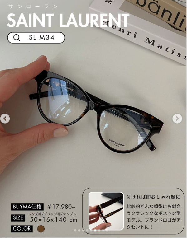 これ1つでおしゃれになれる、クラシックなボストン型のメガネもおすすめ。サイドにはSaint Laurent(サンローラン)のブランドロゴも付いていて程よいアクセントに!