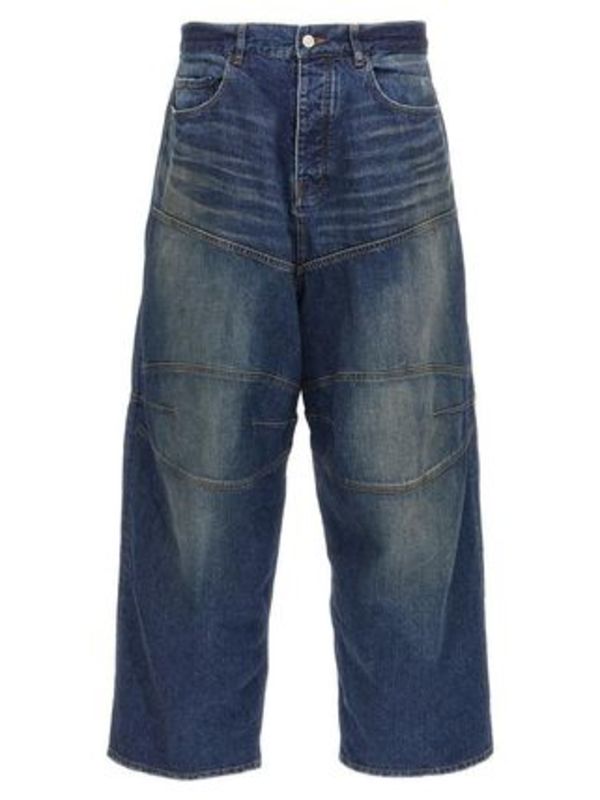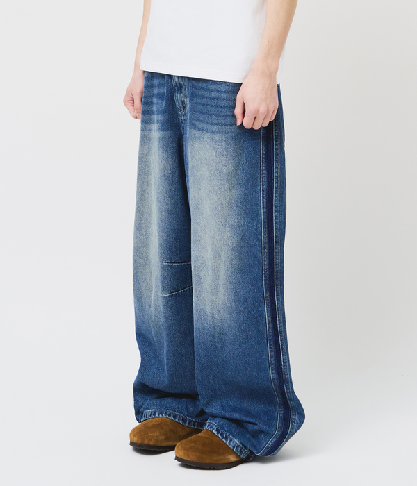 切り替えが施されたワイドデニムはBALENCIAGA(バレンシアガ)のアイテム。ヒゲや色落ちなのどのリアルなヴィンテージ加工がポイントです。アメカジにもモードスタイルにも似合うワイドデニムです。