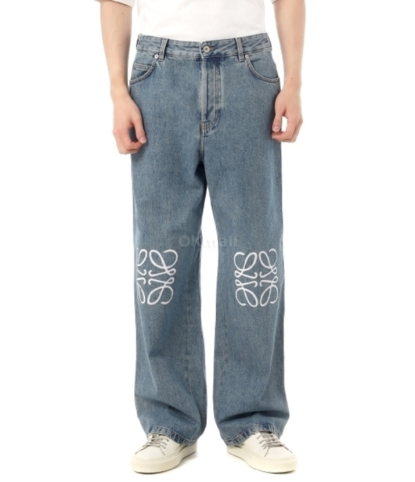 膝にアイコニックなアナグラム刺繍が施されたLOEWE(ロエベ)のワイドデニムは大人っぽい雰囲気。アメカジにもノームコアにも似合う一本です。