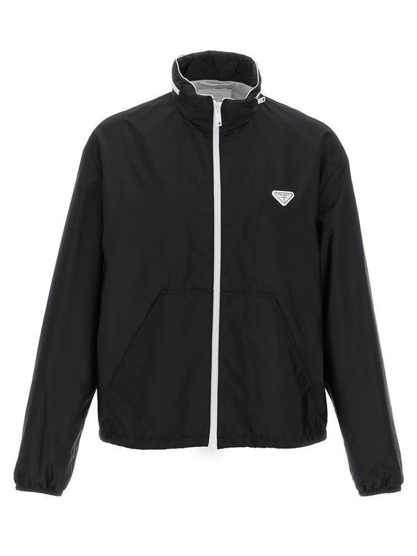 プラダのリサイクルナイロンを使用したジップアップパーカーです。黒のボディに白のトライアングルタグやジップがアクセントとして効いています。スポーティではありますがモードなムードも醸している逸品です。