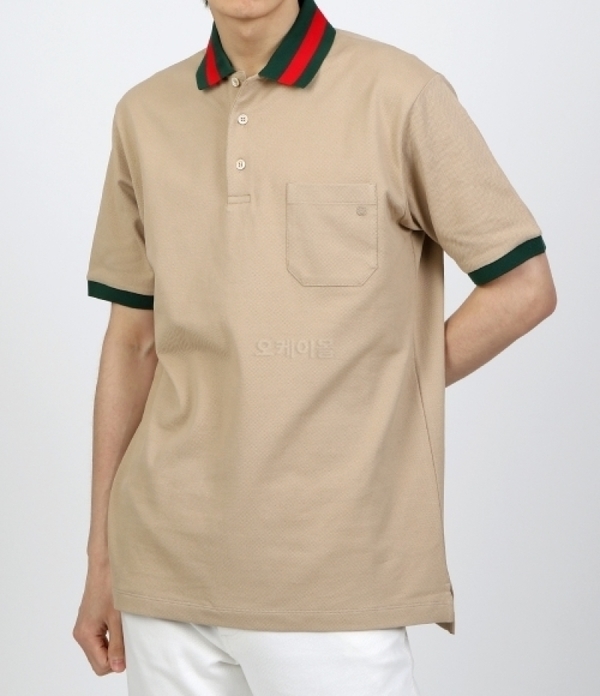 グッチのアイコニックカラーであるグリーンと赤の襟をあしらったポロシャツです。上品なベージュがラグジュアリーな印象。プレッピースタイルにも最適なポロシャツです。