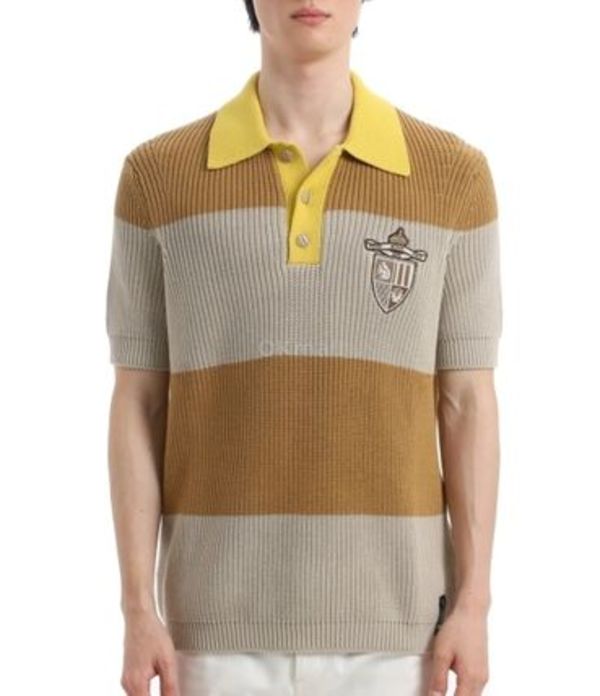 ピッチの広いブラウンとベージュのボーダーにエンブレムがラグジュアリーなフェンディのポロシャツです。リブ素材なのでタイトなシルエットを楽しむことができます。