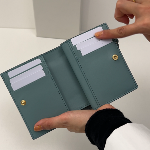 カードは最大12枚収納可能。コンパクトながら、片側サイドにマチのついたコインケースやポケットもついて収納力があります。
