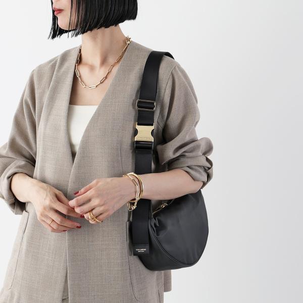 弱撥水性の光沢のあるナイロン素材にバックルのゴールドが上品な印象です。長財布やペットボトルなどが収納でき、内側のポケットが充実しているのでコンパクトながら使い勝手◎