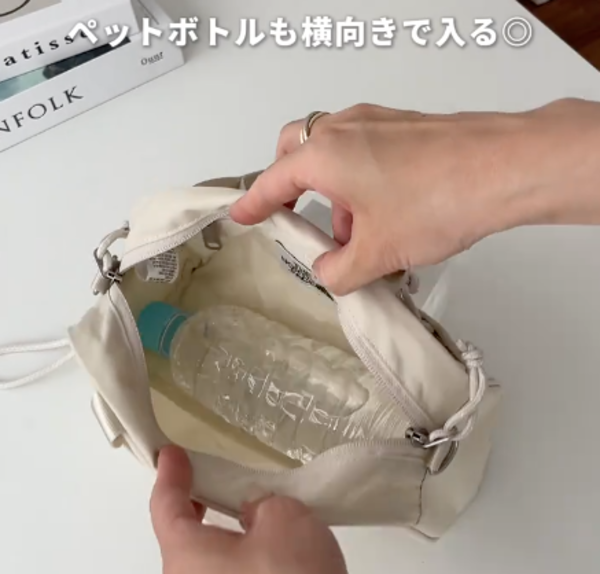 ∟ちなみに夏の必需品・500mlのペットボトルも横向きで収納可能です!ペットボトルが収納できるかできないかが、夏の相棒バッグの第一条件なんて方も多いのではないででしょうか。