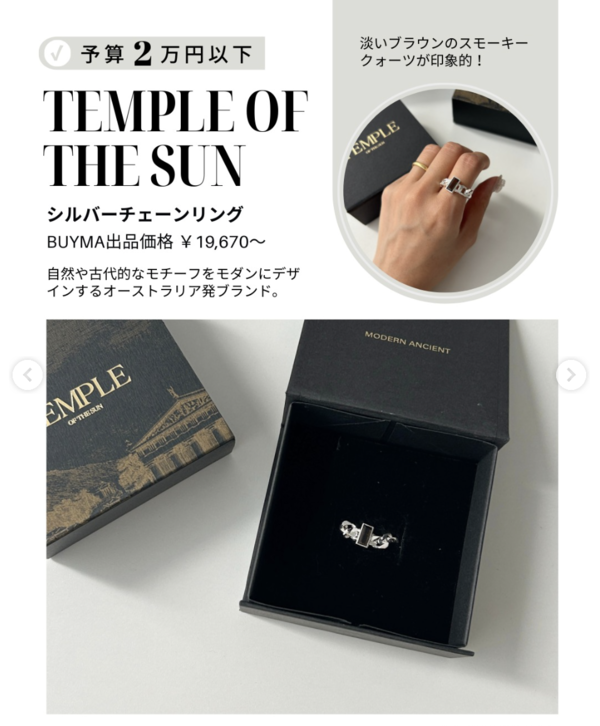 オーストラリア発のジュエリーブランド。自然や古代的なモチーフをモダンにデザインしており、1つあるとコーディネートのポイントになりそう。スモーキークオーツが他にはなく印象的!