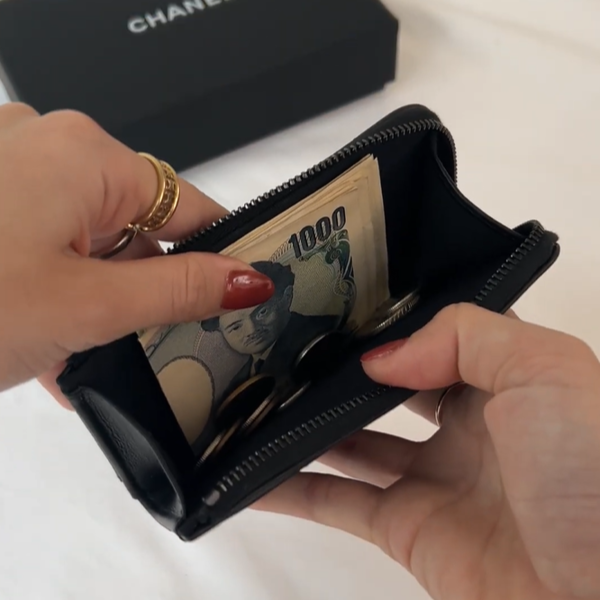 CHANEL(シャネル)のバズりまくったオールブラックのフラグメントケース♡ロゴまでブラックなので、ラグジュアリーになりすぎず大人っぽく持てます。お札は二つ折りでたっぷり入るので、現金派さんのちょっとしたお出かけにも最適です。