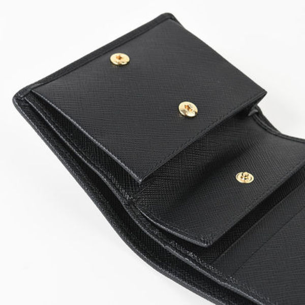 サフィアーノレザー×ナイロンのプラダらしい二つ折り財布。真っ黒でもトライアングルロゴや素材の光沢感で全く地味に見えない、高級感溢れるビジュアル!ナイロンなので、傷もつきにくくガシガシ使える耐久性も魅力的♡金具のカラーはゴールドorシルバーと2種類あり、お好みに合わせてチョイスすると〇