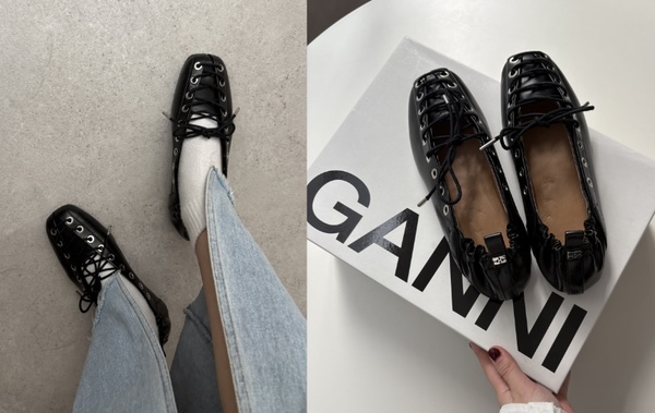 デンマークを拠点に誕生したファッションブランドGanni(ガニー)のバレエシューズはほんのり艶めきをまとったフェイクレザー製で、レースアップ+金属リングのデザインが小粋な雰囲気。甘さ控えめのブラックなら大人でも挑戦しやすく、伸縮性がありクイックに脱ぎ履きすることができるのも嬉しいポイントです。