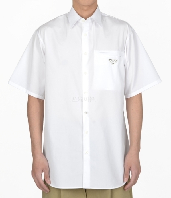 ベーシックなカタチの半袖シャツはプラダの定番アイテム。胸にあしらった、アイコニックなトライアングルロゴがアクセントとして効いています。品のいい半袖シャツなので着こなしを選びません。