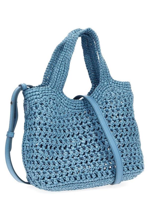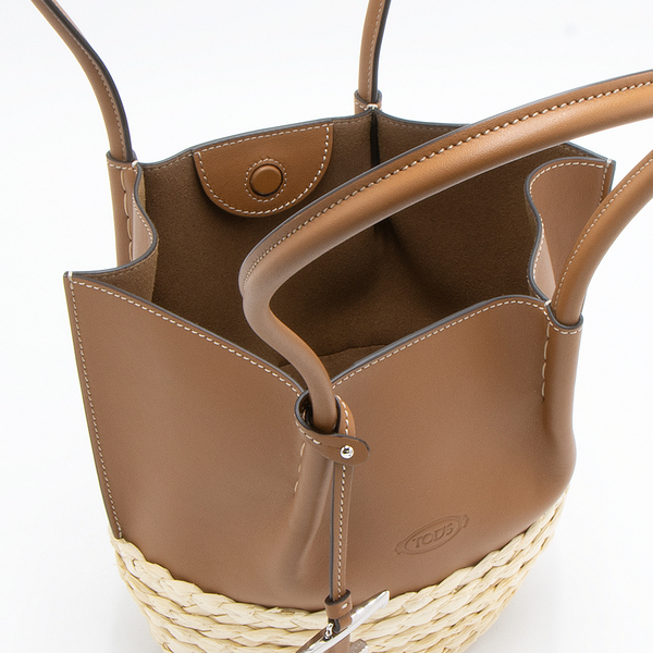 ハンドメイドのかぎ針編みラフィアを使用したショッピングバッグ。レザーのオーバル型にトッズのロゴが型押しされ、夏らしいムードが漂います。
