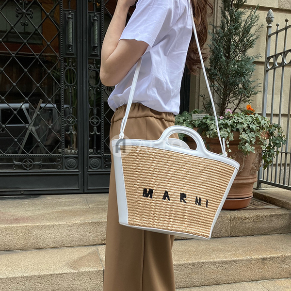 フロントに刺繍されたブランドロゴが大人キュートなかごバッグ。マルニの定番となっている毎夏大人気のデザインです。