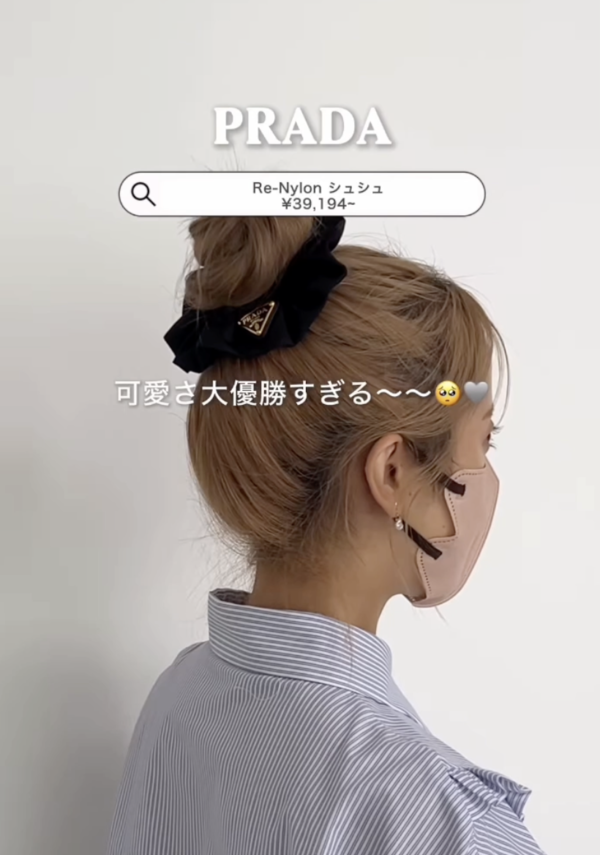 小物も妥協しないあなたにオススメ♡ギフトにも喜ばれる「プラダ」のシュシュは、髪に巻くだけで大人かわいいし、手首に付けるだけでもサマになる三角プレートロゴがオシャレ♪