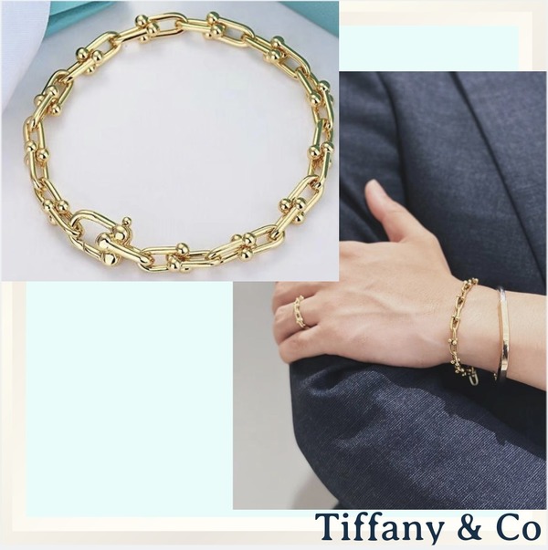 ティファニーの人気コレクションであるハードウェアのスモールリンクブレスレットです。ゴールドですが細めなのでかなり上品。スーツにも似合うブレスレットです。