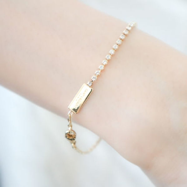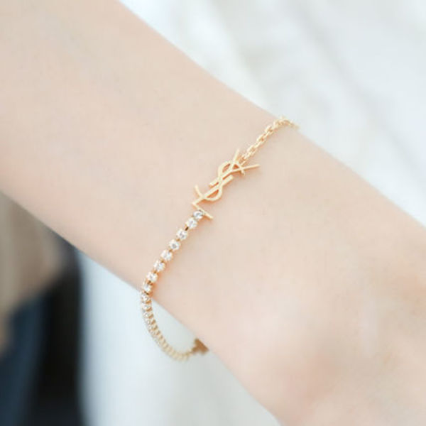 ゴールドのケーブルチェーンに、「YSL」モノグラムチャームと小粒のラインストーンをあしらった上品なブレスレットです。サイドには繊細な輝きを放つストーンが配され、華やかな印象に仕上がっています。