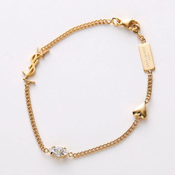 サンローランらしい洗練されたデザインに、可憐なハートチャームと煌めくラインストーンを組み合わせたブレスレット。ゴールドカラーが肌になじみ、YSLのアイコニックなカサンドラロゴがさりげなく存在感を放ちます。