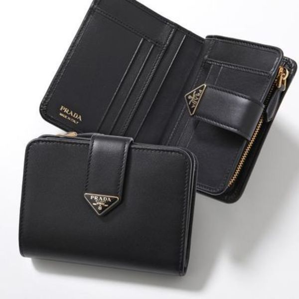 現金派さんhなら、プラダのこちらの二つ折り財布がおすすめ!外側についたコインケースは、なんと仕切りが合って二つの部屋に分かれているので、がばっと開いて中身も見渡しやすいです。