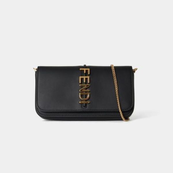 カーフレザーにゴールド仕上げの**「FENDI」メタルロゴ**があしらわれた、エレガントな佇まいが特長です。シンプルながらブランドのアイコン性を感じさせるデザインがクラス感を後押しします。