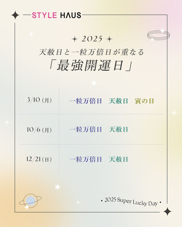 一番縁起のいい日というだけあり、1年の中でも該当する日はかなり少なめ。2025年は3月10日、5月25日、7月24日、8月7日、10月6日、12月21日の計6回しかないのでしっかりと押さえておきましょう。
